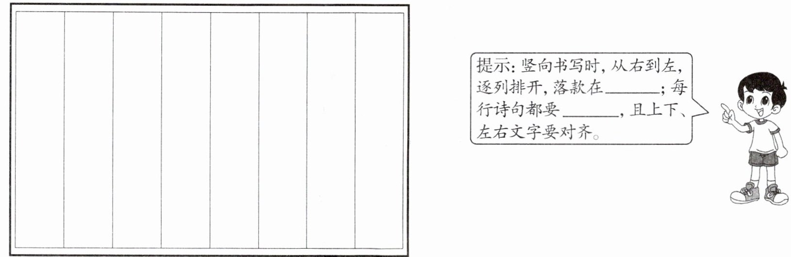 提示:竖向书写时,从右到左,逐列排开,款落在左下角;每行诗句都要居中书写,且上下、左右文字要对齐。