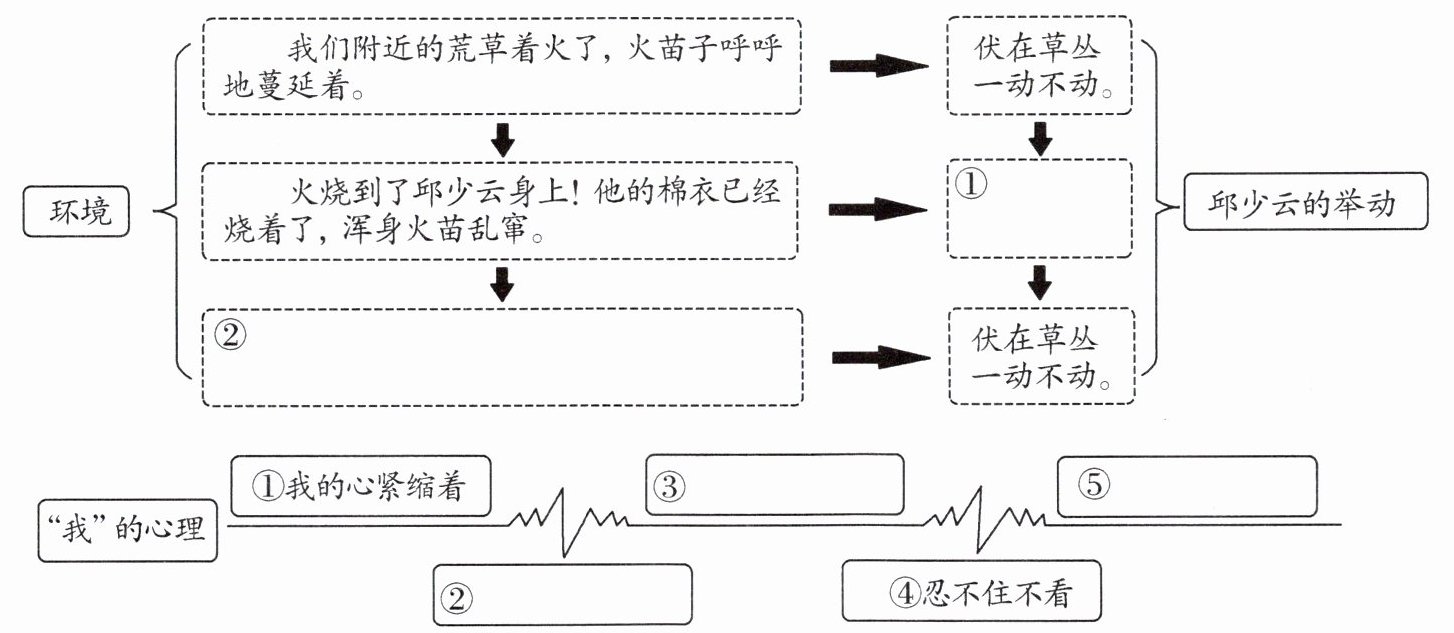 (图中内容:环境框指向“我们附近的荒草着火了,火苗子呼呼地蔓延着。”,箭头向下指向“火烧到了邱少云身上!他的棉衣已经烧着了,浑身火苗乱窜。”;该内容箭头向右指向①(空白框