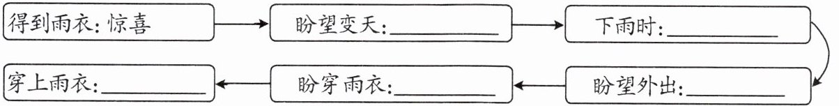 ;盼来雨天,快乐出门等小事件。 2. “盼”的过程中“我”的心情是不断变化的,请根据提示,写出体现“我”心情的词语。