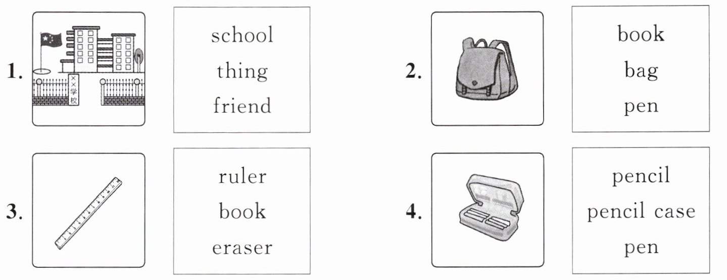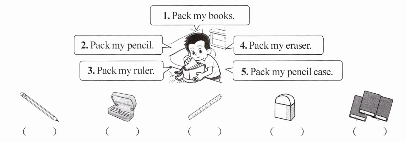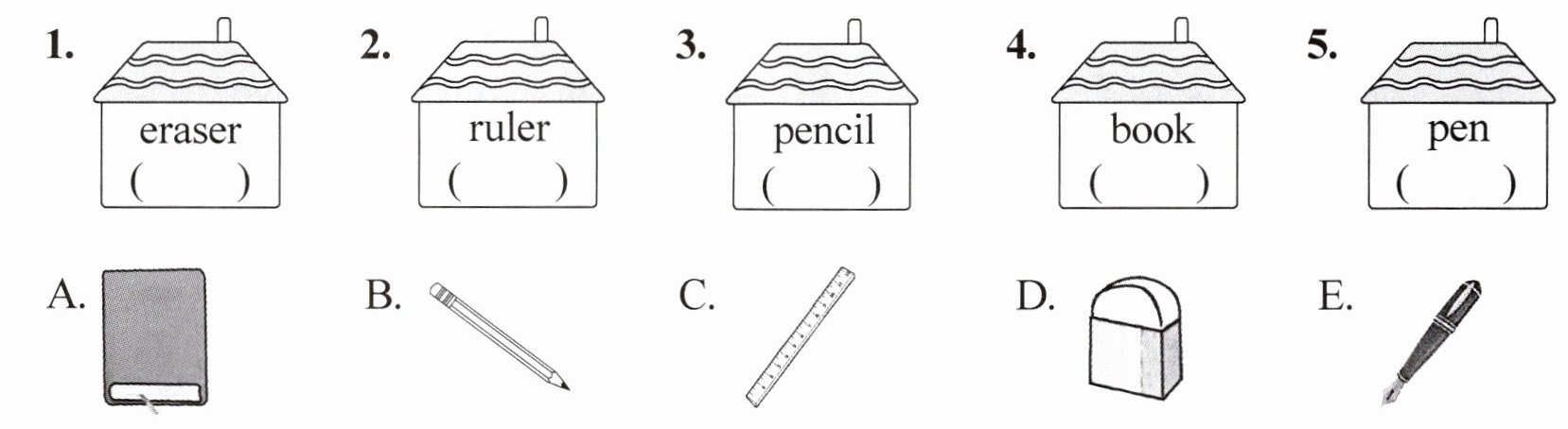 三、设计完板报后,Lele 想要将弄乱的学习用品放回原位,你能帮助它们回家吗?(将对应图片的选项填入对应的括号中)