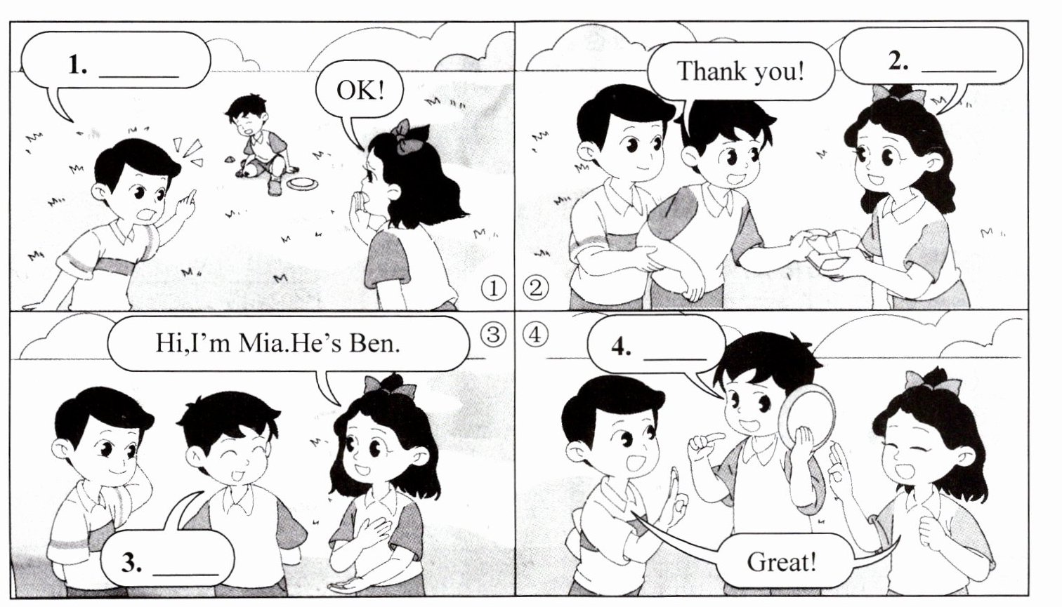 3. 第三幅图中女孩说“Hi, I'm Mia. He's Ben.”,这是在介绍自己和本,那么男孩应该回应“Hello, I'm Lele.”。