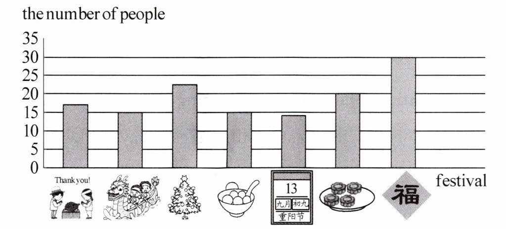 )2. What festival do 20 people like?A. The Lantern Festival. B. The Mid-Autumn Festival. C. Christmas.