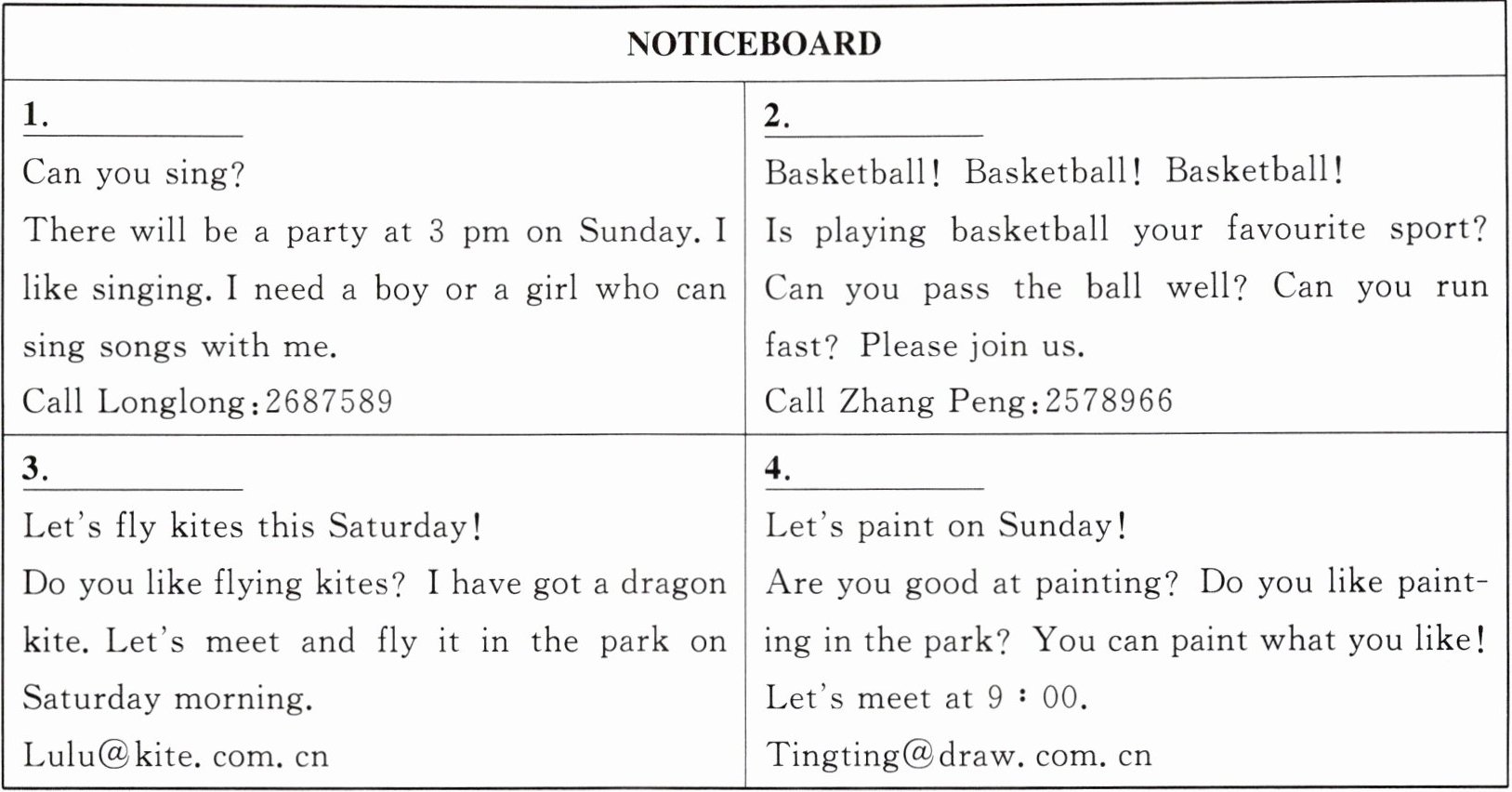 Let's paint on Sunday!Are you good at painting? Do you like painting in the park? You can paint what you like!Let's meet at 9:00.Tingting@draw.com.cn |任务一:为公告栏的四则信息,选择合适的图片,将序号填在横线上。