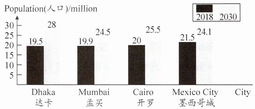 )3. had the largest(最大的) population in 2018.A. Dhaka B. Cairo C. Mexico City