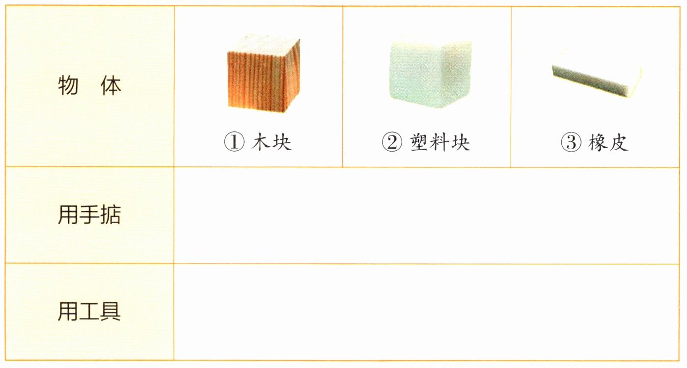 综上,用手掂:①木块>②塑料块>③橡皮;用工具:①木块>②塑料块>③橡皮。