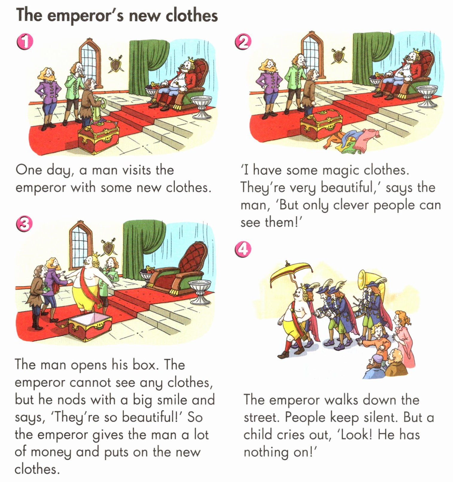 1. He says, 'I have some magic clothes. They're very beautiful, but only clever people can see them!'