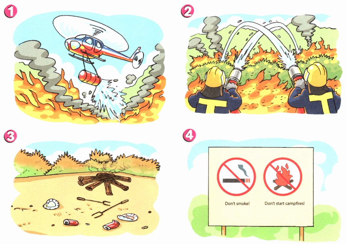 【解析】:本题主要考查阅读理解与图片匹配能力。解题的关键在于仔细阅读每段文字描述,然后找出与之对应的图片。第一段文字描述了一场大火,起因是人们生火野营,对应图片3中地上有篝火及周围散落物品的场景;第二段文字描述乡村公园有火灾,浓烟滚滚,直升机在灭火,对应图片1中直升机在空中灭火的场景;第三段文字描述消防员勇敢灭火,使用大量水,火势减弱,对应图片2中消防员用水灭火的场景;第四段文字描述消防员在公园放置了一个标志,对应图片4中的标志场景。