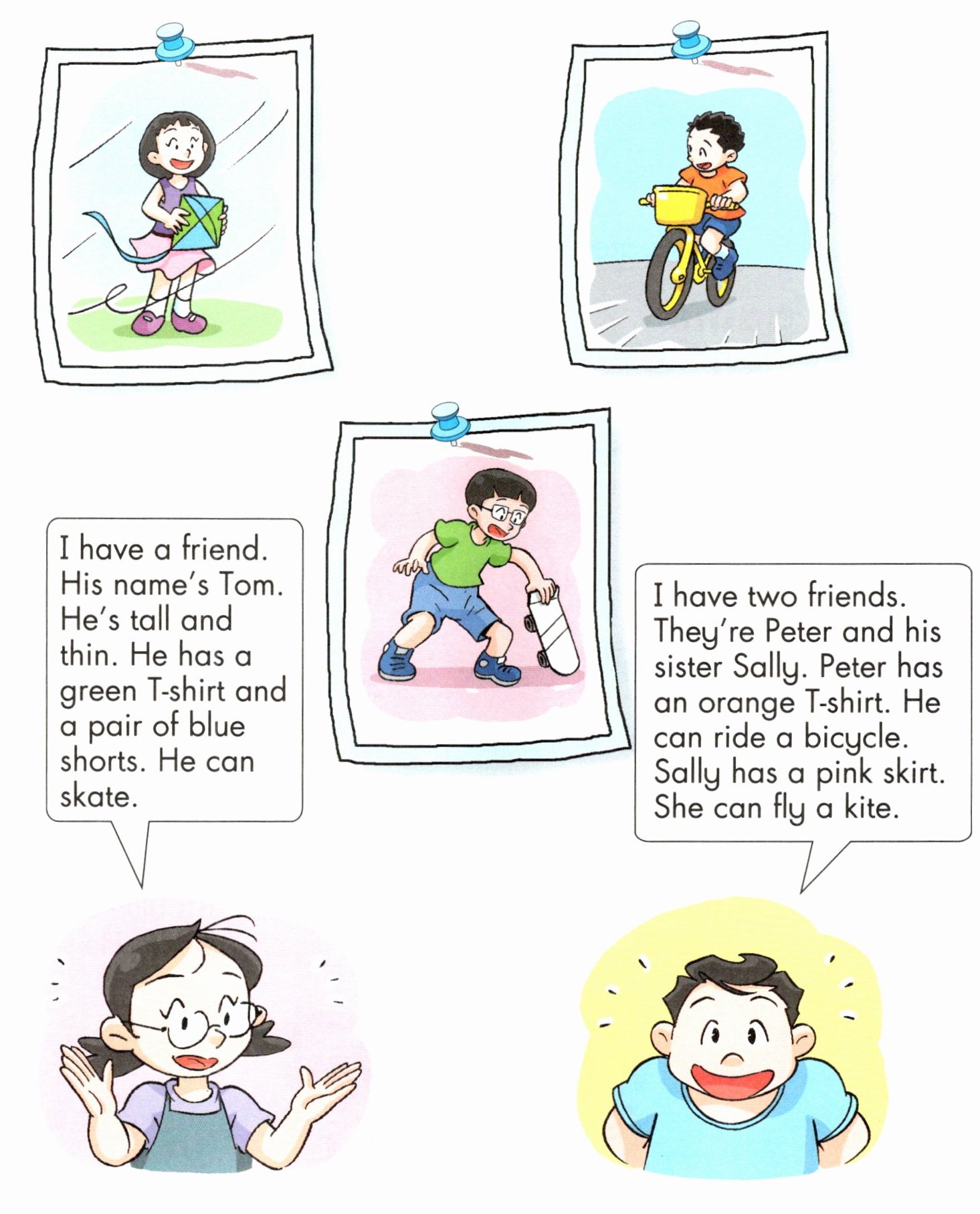 A: I have a friend. Her name's Lily. She's short and cute. She has a purple top and a pink skirt. She can fly a kite.
