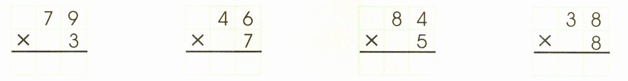 $\begin{array}{r r r}&&&&7&9 \\ ×&&&&&3 \\ \hline &&&2&3&7\end{array}$