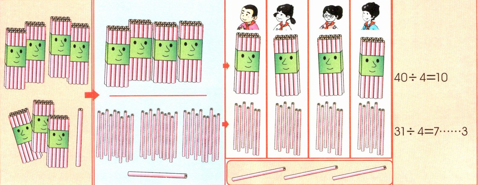 解析:本题主要考查两位数被一位数除的运算,涉及到除法运算中的分步计算以及余数的概念。通过将$71$拆分为$40$和$31$,分别计算$40$和$31$除以$4$的商和余数,最后将商相加得到每人分到的铅笔数,余数就是剩余的铅笔数。
