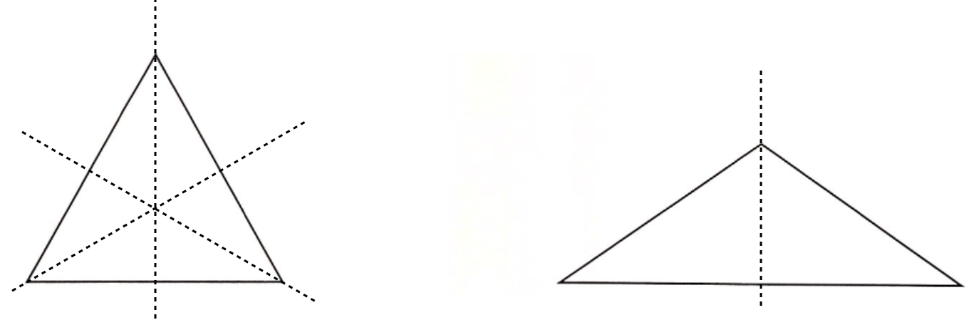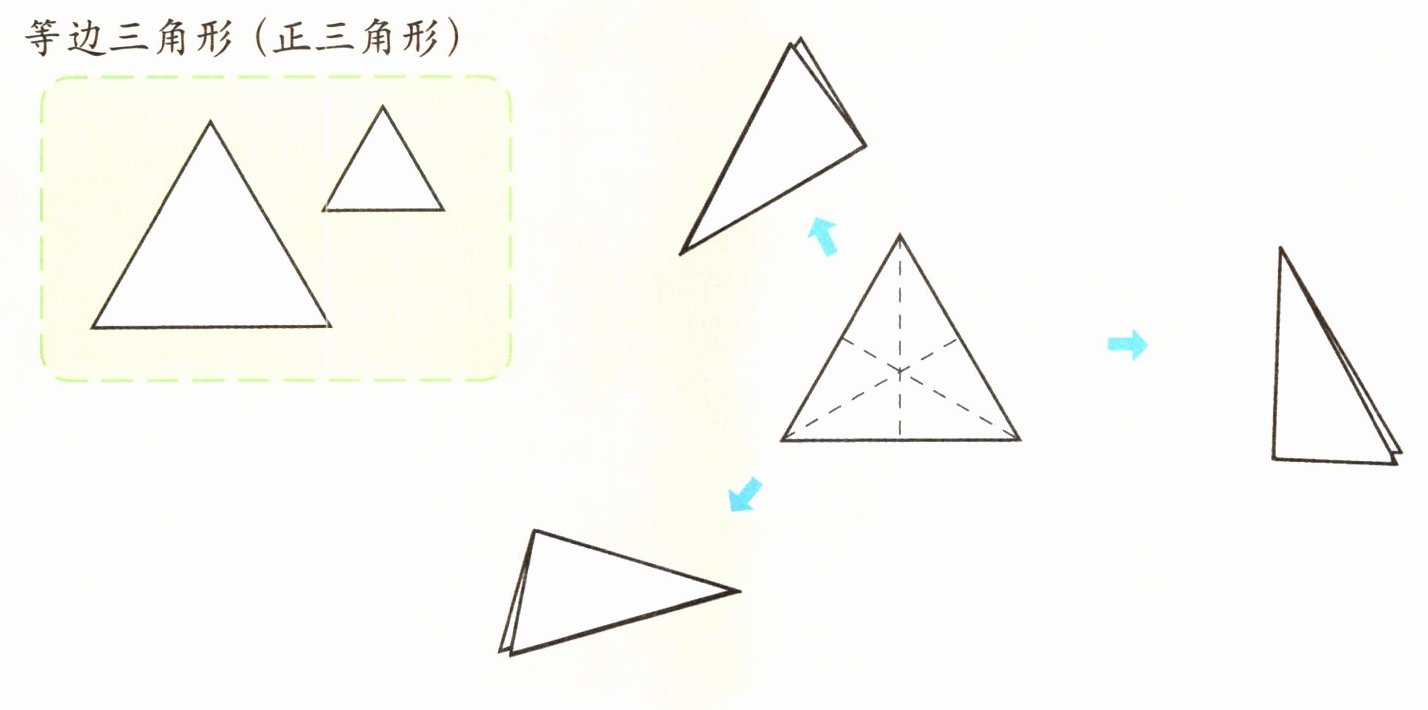 2 等腰三角形、等边三角形是轴对称图形吗?将附页中的等腰三角形、等边三角形先折叠,再沿折痕画出对称轴。