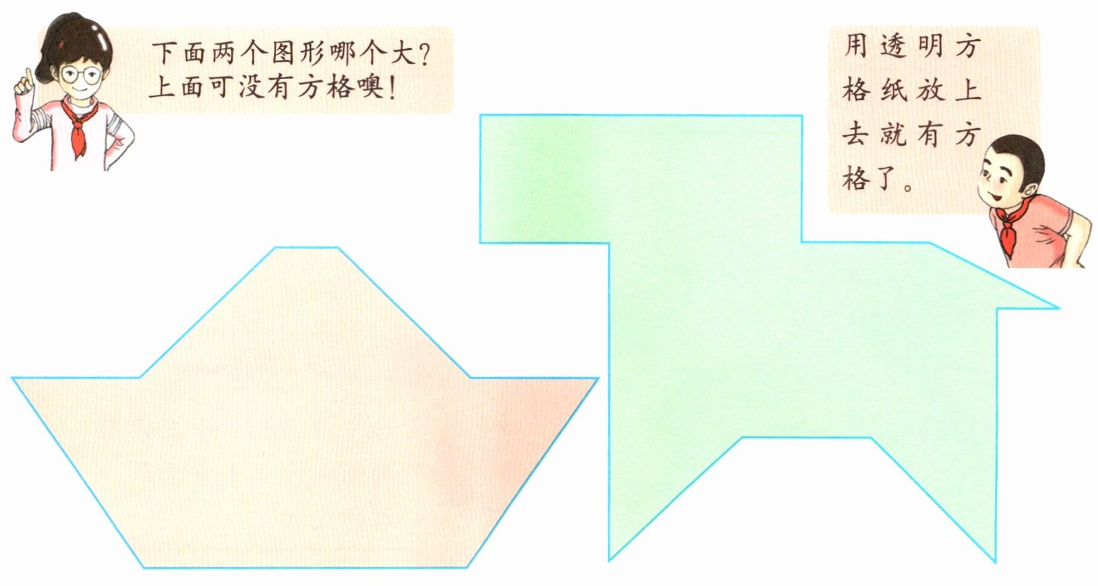下面两个图形哪个大?上面可没有方格噢!用透明方格纸放上去就有方格了。这些图形的大小就是它们的面积。