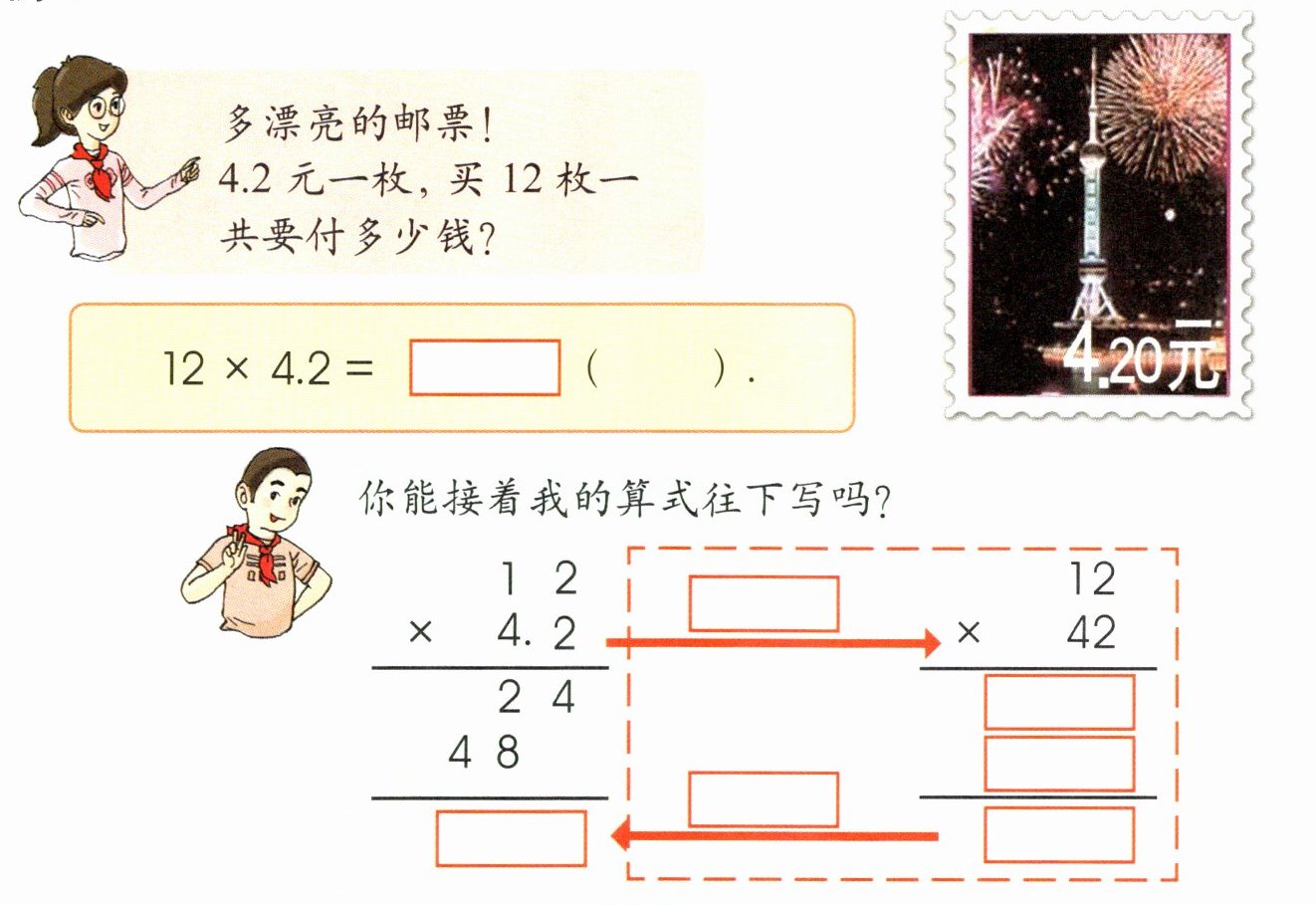 因数$4.2$有一位小数,从积$504$的右边起数出一位点上小数点,得到$50.4$。