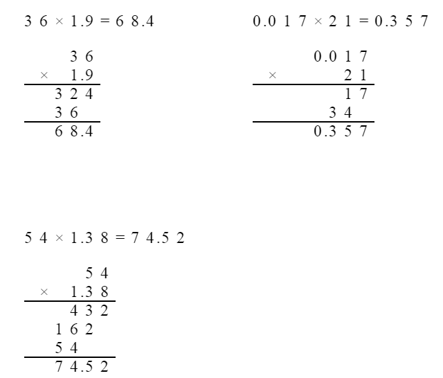 先按照整数乘法的方法算出积,再根据因数中小数部分的位数,在积中从右往左数出相应位数,点上小数点。