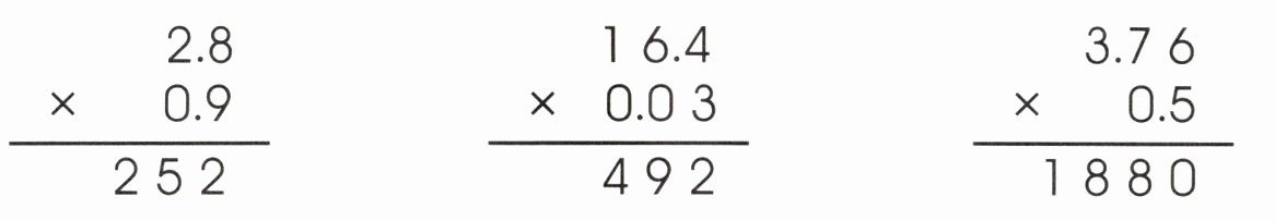 第一个式子:两个因数中一共有$2$位小数,所以从$252$的右边起数出$2$位,点上小数点,即$2.52$。