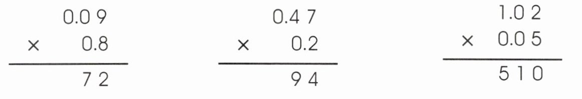 两个因数中一共有$2 + 1 = 3$位小数,所以$0.09×0.8 = 0.072$。