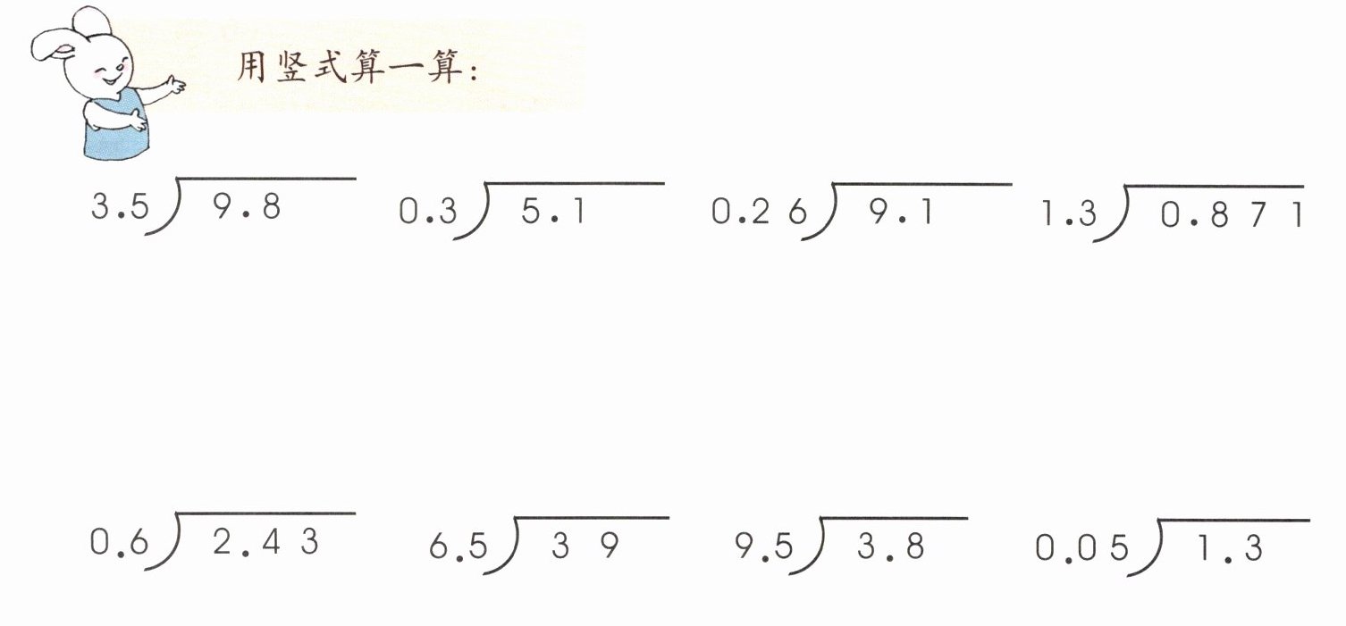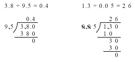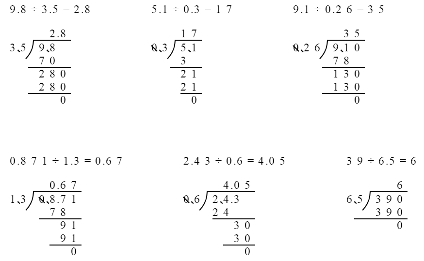 先向右移动除数的小数点,使除数变成整数。除数的小数点右移几位,被除数的小数点也右移几位(位数不够时,在被除数的末尾用“0”补足)。然后按除数是整数的小数除法的方法进行计算。