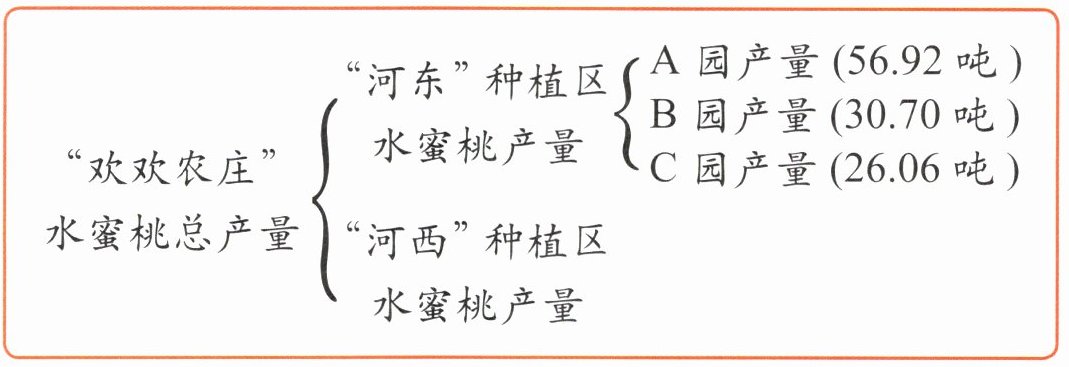 b.已知“欢欢农庄”水蜜桃总产量为$226$吨,“河东”种植区产量为$113.68$吨,那么“河西”种植区的水蜜桃产量等于总产量减去“河东”种植区的产量,即:$226 - 113.68 = 112.32$(吨)。