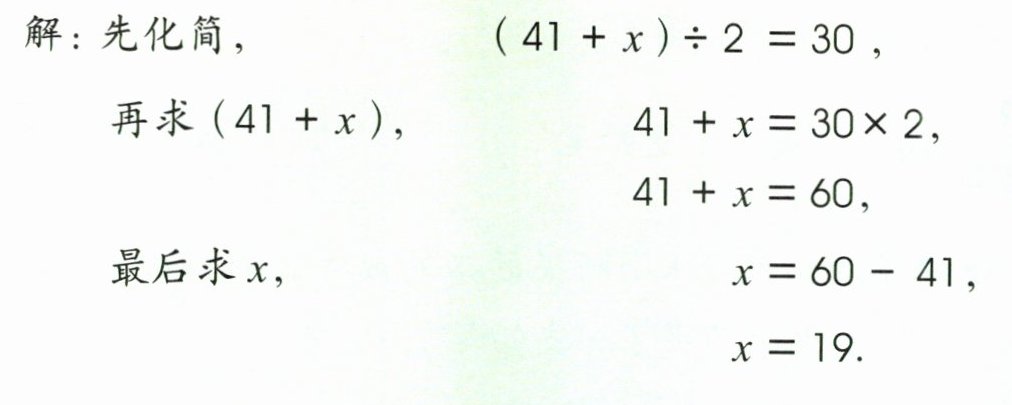 例7 解方程:$(23 + x + 18)÷2= 30$.