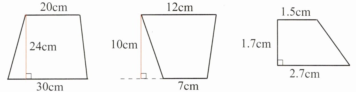 综上,三个梯形的面积分别为$600cm^2$、$95cm^2$、$3.57cm^2$。