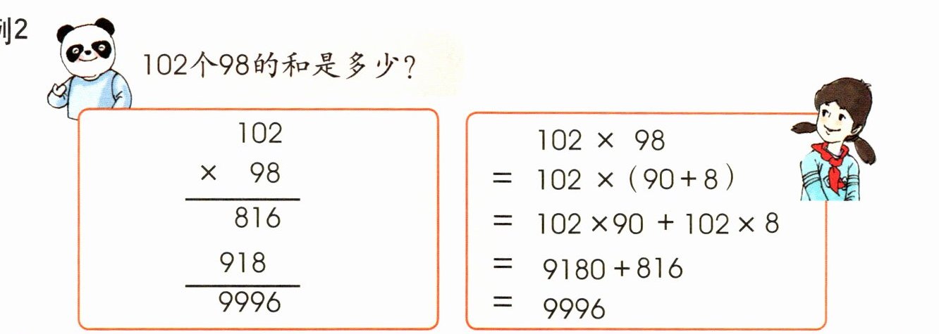 还有不同的算法,如$102×98 = 102×(100 - 2)=102×100-102×2 = 9996$。