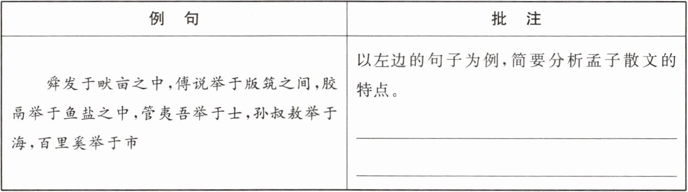 示例:列举了历史上六位名人的事例,构成排比句,形成一种无可辩驳的气势,增强了说服力。体现了孟子散文善用排比、气势非凡的特点。