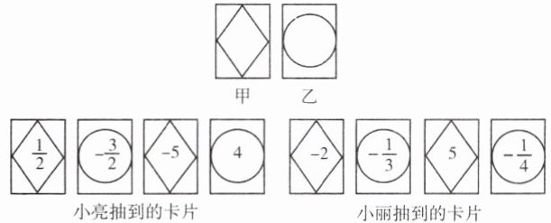 10. 有一个游戏,规则如下:(1)每人每次抽4张卡片,如果抽到甲种卡片,那么加上卡片上的数字,如果抽到乙种卡片,那么减去卡片上的数字。(2)比较两人所抽到的4张卡片的计算数据,数据大的为胜者。小亮和小丽玩这个游戏,他们抽到的卡片如下图所示,通过计算可知( )