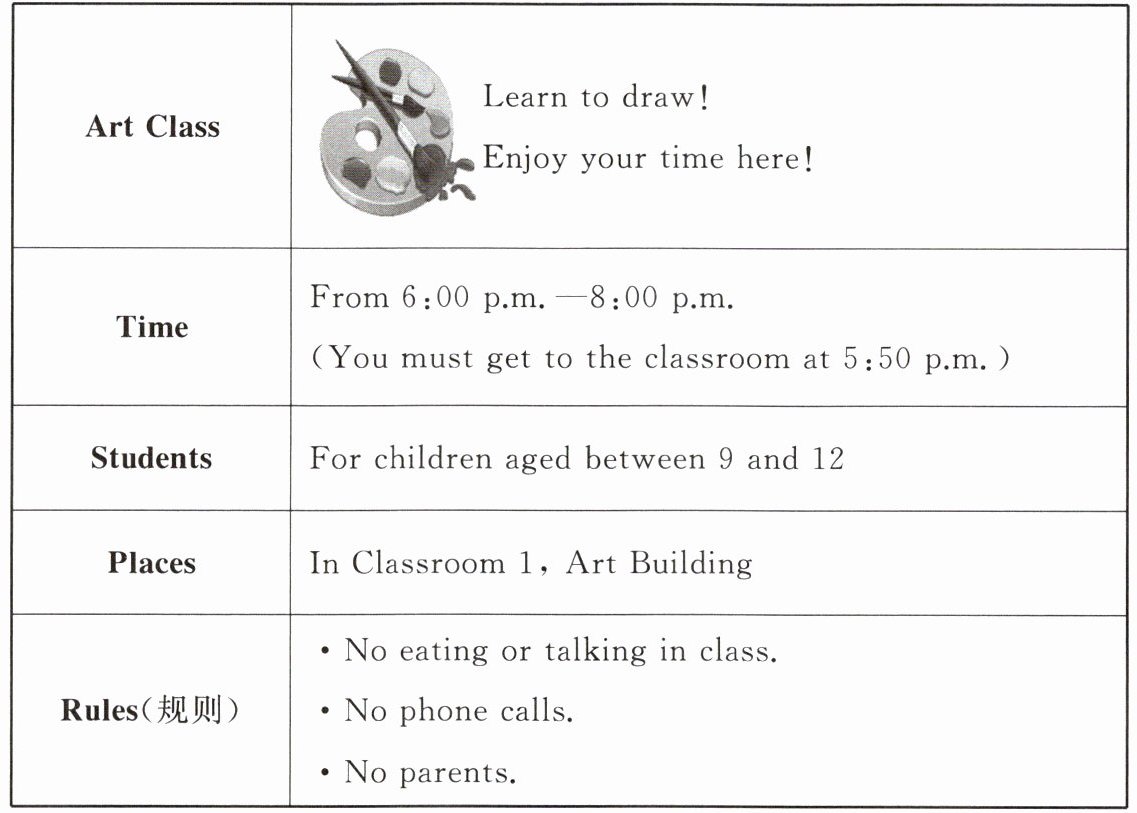 | Rules(规则) | · No eating or talking in class. · No phone calls. · No parents. |