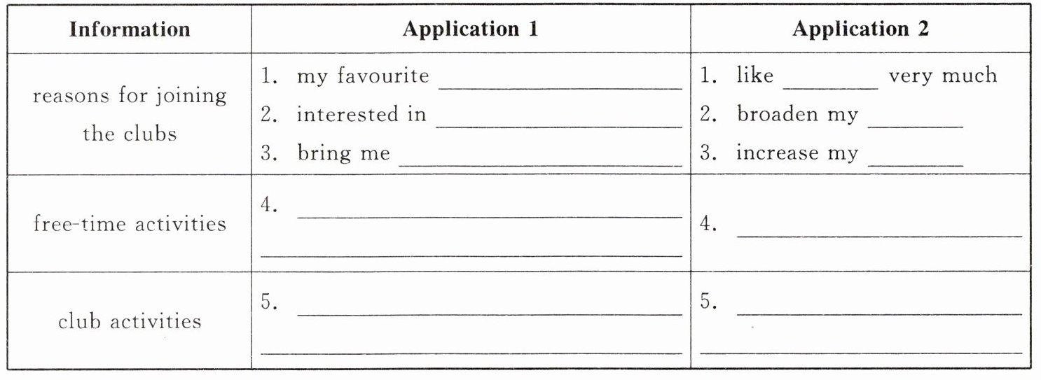 | club activities | 5. write English dialogues,make friends,act out English plays | 5. act out stories,discuss books,share thoughts |