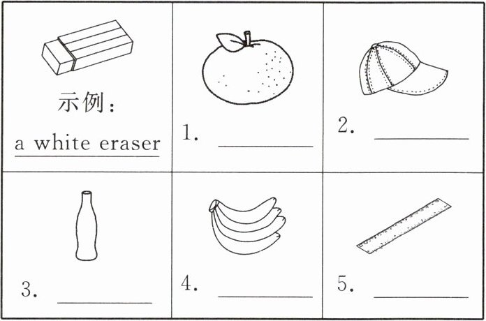 1. an orange orange 2. a brown cap 3. a green bottle 4. four yellow bananas 5. a pink ruler(答案不唯一,合理即可)
