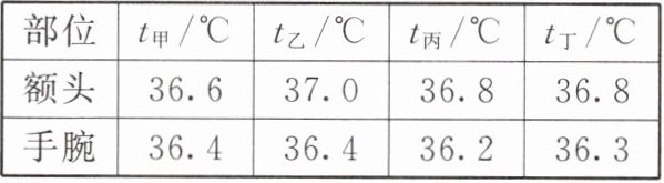 相同。小延对四位同学的额头与手腕分别进行了测量,数据记录如表:|部位|$t_{甲}/^{\circ}C$|$t_{乙}/^{\circ}C$|$t_{丙}/^{\circ}C$|$t_{丁}/^{\circ}C$|