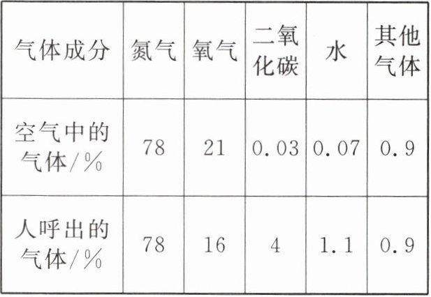 |人呼出的气体/%|78|16|4|1.1|0.9|