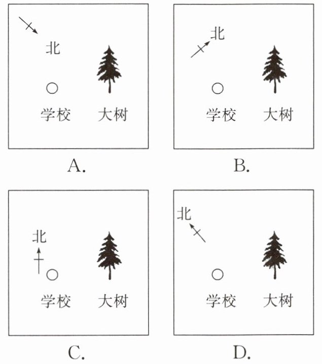 3. 下面四幅平面图中,大树位于学校正东方向的是 (