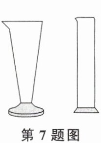 7. 如图所示,量筒和量杯的量程均为0~50 mL(设底部到50 mL刻度线的高度均为h),若倒入25 mL的液体,则量筒中所装液体的高度