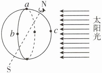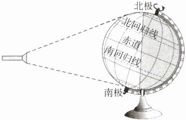 6. 演示地球自转时,用手电筒模拟“太阳”,拨动地球仪,如下图所示。读图,回答下列问题。