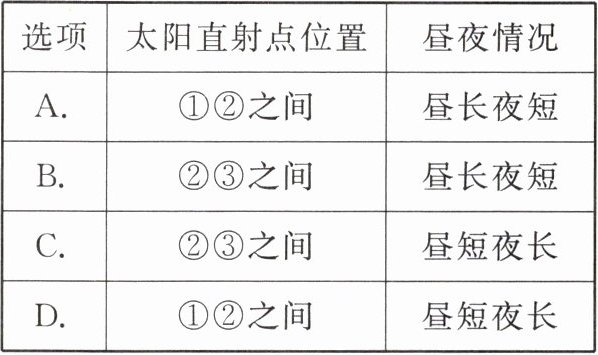 | 选项 | 太阳直射点位置 | 昼夜情况 |
