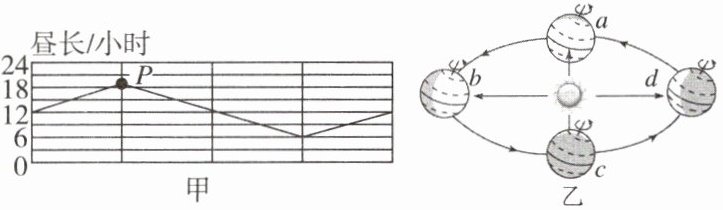 2. 图甲是北半球某地一年内昼长变化图,图乙是地球公转轨道示意图。当该地昼长为图甲中的P时,地球大致位于图乙中的(