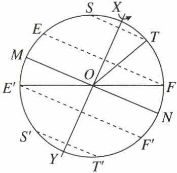 12. (9分)如图所示,XOY为地轴,MN为赤道,EF、E'F'为回归线,ST、S'T'为极圈。读图回答下列问题。