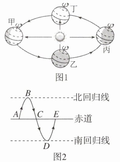 11. (12分)读地球公转轨道示意图(图1)和太阳直射点的移动规律图(图2),回答下列问题。