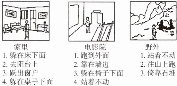 (1)假如你是图中场景的人物,地震即将来临,在短时间内你只有一次选择机会,你会选择哪种避震方式?请做出选择:家里