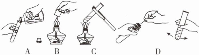 ,然后用酒精灯的外焰对准药品所在部位加热。(4)如图D所示,如果试管内壁附有不易洗掉的物质,清洗试管时一般先用