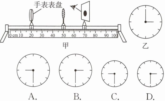5. 在“探究凸透镜成像规律”实验中,所用凸透镜的焦距为f,光屏是用表面涂有白漆的铁板制成。小明把夜光显示的手表置于光具座上,移动光屏,当手表与光屏分别处于图甲所示的位置时,小明看到光屏上呈现清晰的像。若此时手表表盘指针位置如图乙所示,则小明看到光屏上呈现的像为图中的( )