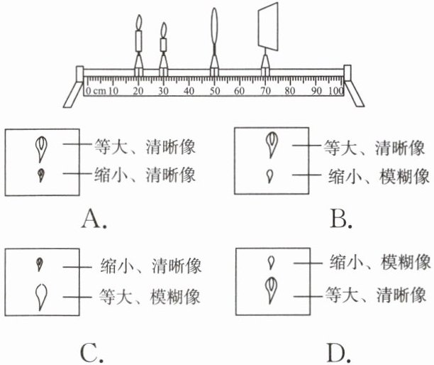 4. 为了探究凸透镜成像的规律,小明用两根高度不同的蜡烛、焦距为10 cm的凸透镜和光屏等器材按下图进行实验,则小明在光屏上观察到的烛焰成像的情况是( )