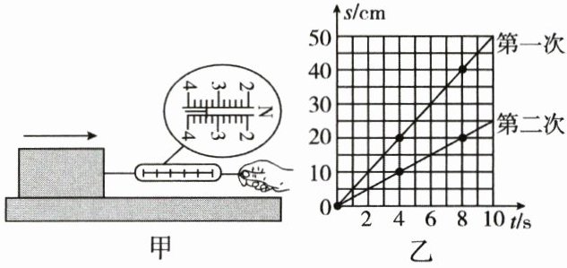 10. 用弹簧测力计两次水平拉同一木块(如图甲所示),使它在同一水平木板上做匀速直线运动,图乙是木块运动的路程随时间变化的图像。下列说法正确的是(