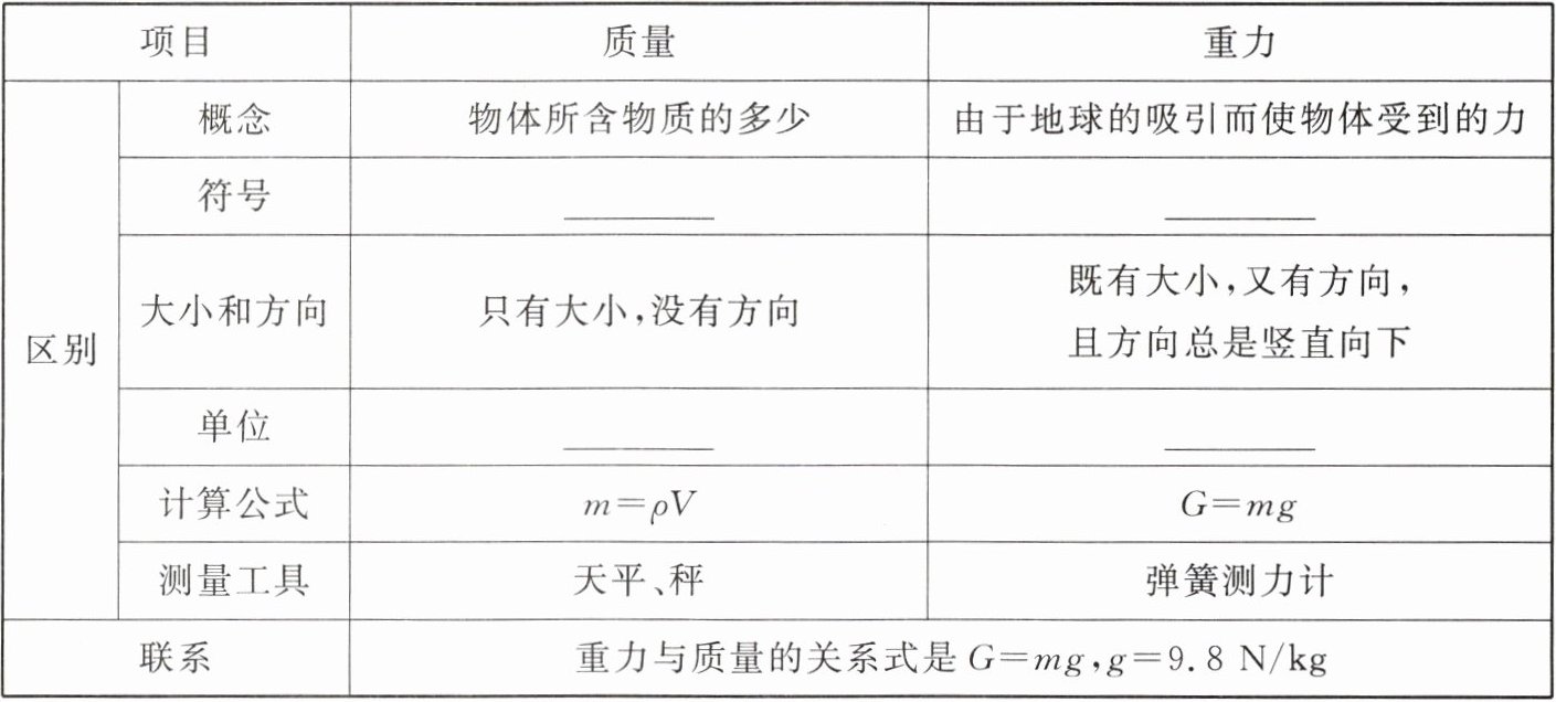 | | 联系 | 重力与质量的关系式是$G= mg,g= 9.8N/kg$ |