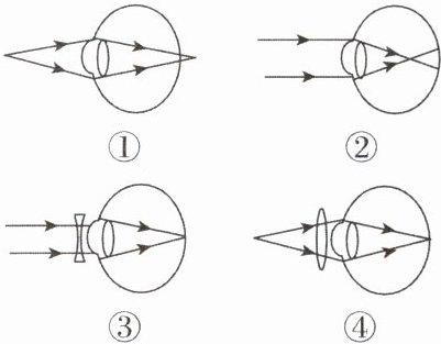 4. 鱼类为了能够在水中看物,其眼睛的晶状体几乎圆得可以“混珠”,以此来保证有足够的折光力。若传说中生活在海洋里的美人鱼上岸后,下图中能正确表示美人鱼的眼睛的成像情况和矫正方法的是( )