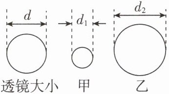 9. 小明为辨别直径相同的两透镜的类型,分别将它们正对太阳,把一张纸放在它们的下方,在纸上得到相应的光斑,透镜与光斑的大小如图所示$(d_1<d<d_2)。$其中形成甲光斑的是______(填“凸”或“凹”)透镜,判断的理由是______。为了判断形成乙光斑的是哪种类型的透镜,小明将透镜远离纸片,观察光斑的大小一直变大,由此小明判断此透镜______(填“一定”“可能”或“一定不”)是凹透镜。