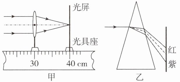 (3)小雷回想起白光经三棱镜折射后,光屏上自上而下出现了红、橙、黄、绿、蓝、靛、紫的色带(如图乙所示)。受此启发,他分别用红光和紫光进行图甲所示的实验,得出结论:对于同一凸透镜,______(填“红光”或“紫光”)入射时焦距小些。