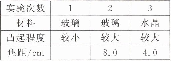 10. 小雷对凸透镜焦距与制成凸透镜的材料种类、凸透镜凸起程度的关系进行了探究实验。
