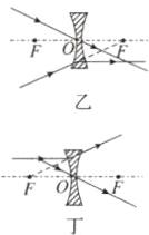(3)已知图中的凹透镜和凸透镜的焦距相同,根据两种透镜对光的作用,画出已知光线的入射光线和折射光线。